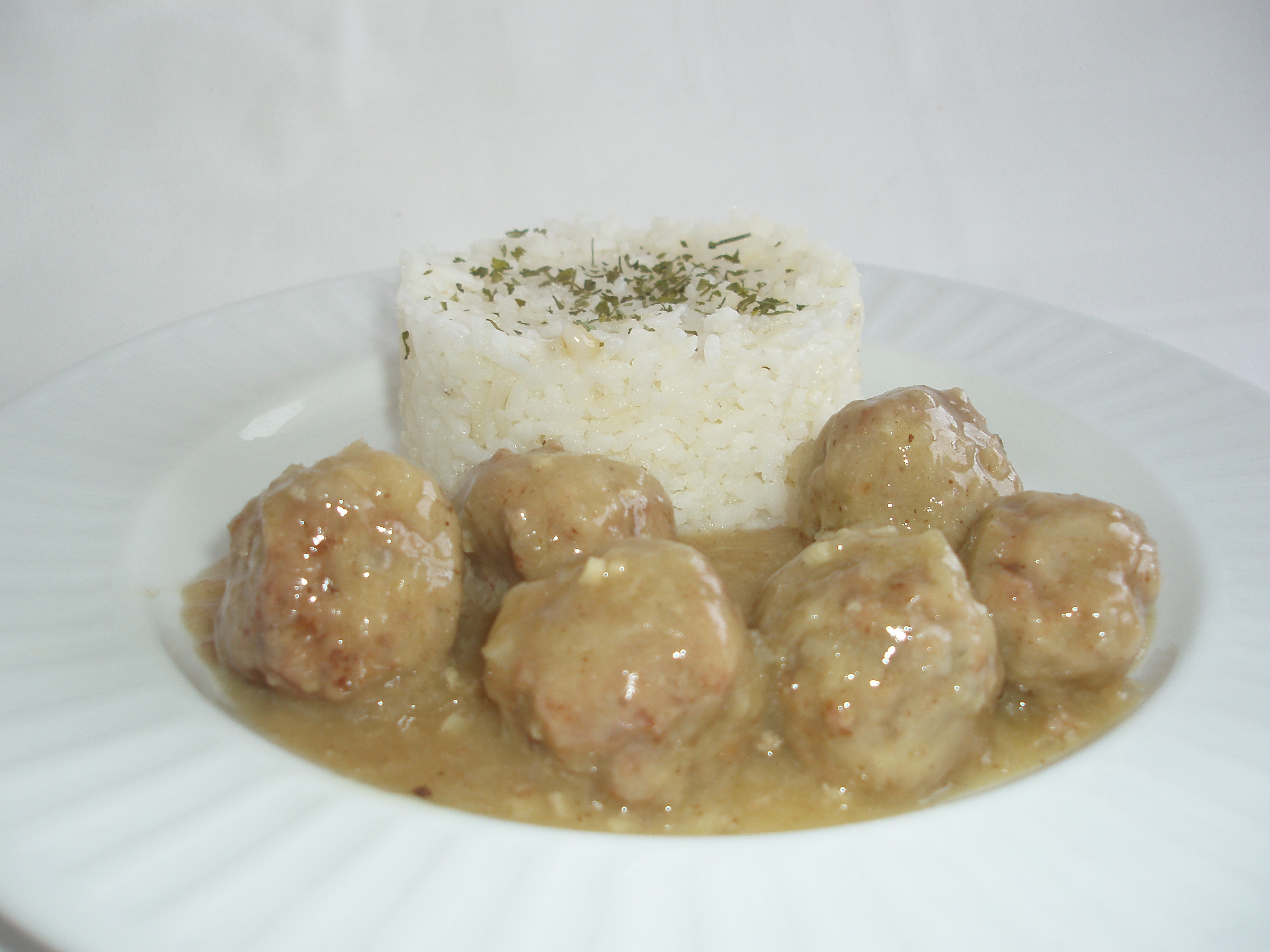 La segunda, como no, son las albóndigas que encantan a los niños y no tan niños. Esta vez las bolas las hacemos pequeñitas y las pasamos por harina friéndolas en tandas hasta que doren. En una pota hacemos una salsa rubia, rehogando un poco de cebolla y ajo, añadiendo una cucharada de harina y cuando dore un chorretón de vino blanco dejando que evapore el alcohol. Agregamos una pastilla de caldo y agua caliente (500ml más o menos) y removemos para que ligue. Metemos las albóndigas y dejamos cocer unos veinte minutos removiendo de vez en cuando para que no se peguen. A mi me encantan con arroz blanco.