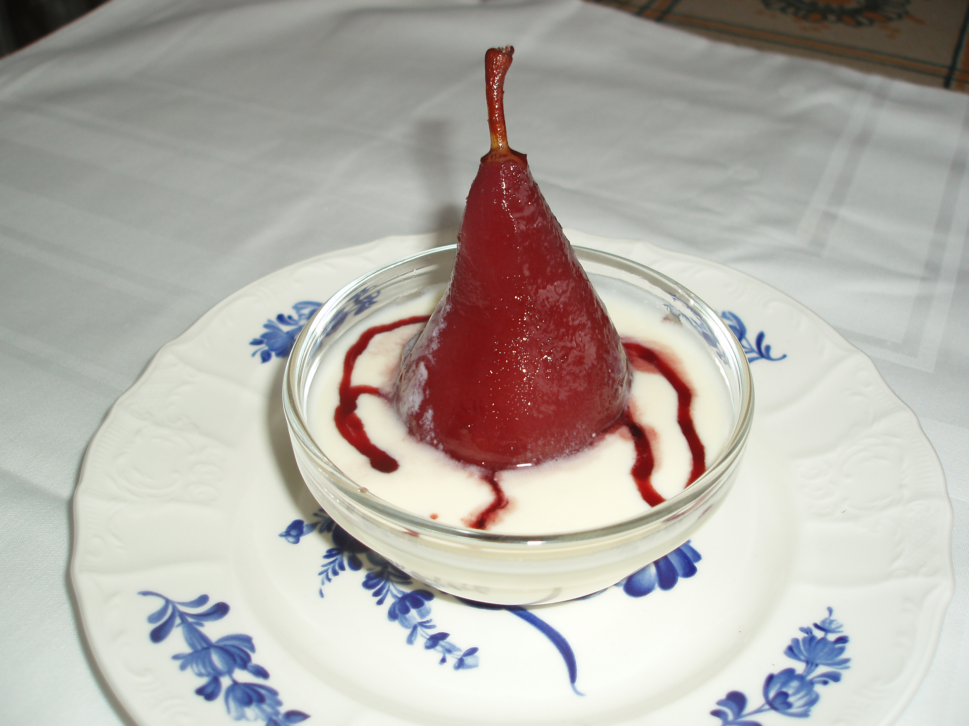 El plato yo lo presento servido de manera individual en unos cuenquitos poniendo en la base las natillas y encima, de pie, la pera. Y cuando quiero que quede aún más mono reduzco a fuego vivo un poco del vino de cocer las peras y lo echo por encima.