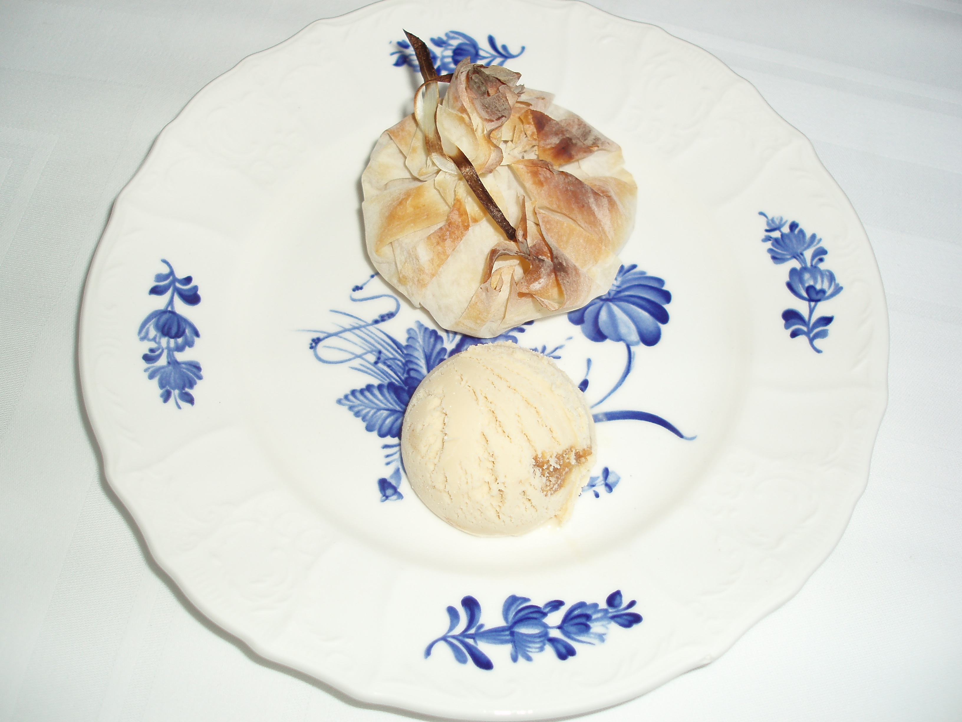 El otro día me regalaron una patina de rebeco y no pude por menos que invitar a los amigos a comerla, pero no os asustéis que no van por ahí los tiros, nunca mejor dicho. Después de unas estupendas fabes con rebeco, y para desengrasar la maquinaria, les hice unos saquitos de manzana estilo alemán acompañados de helado de vainilla al burbon.