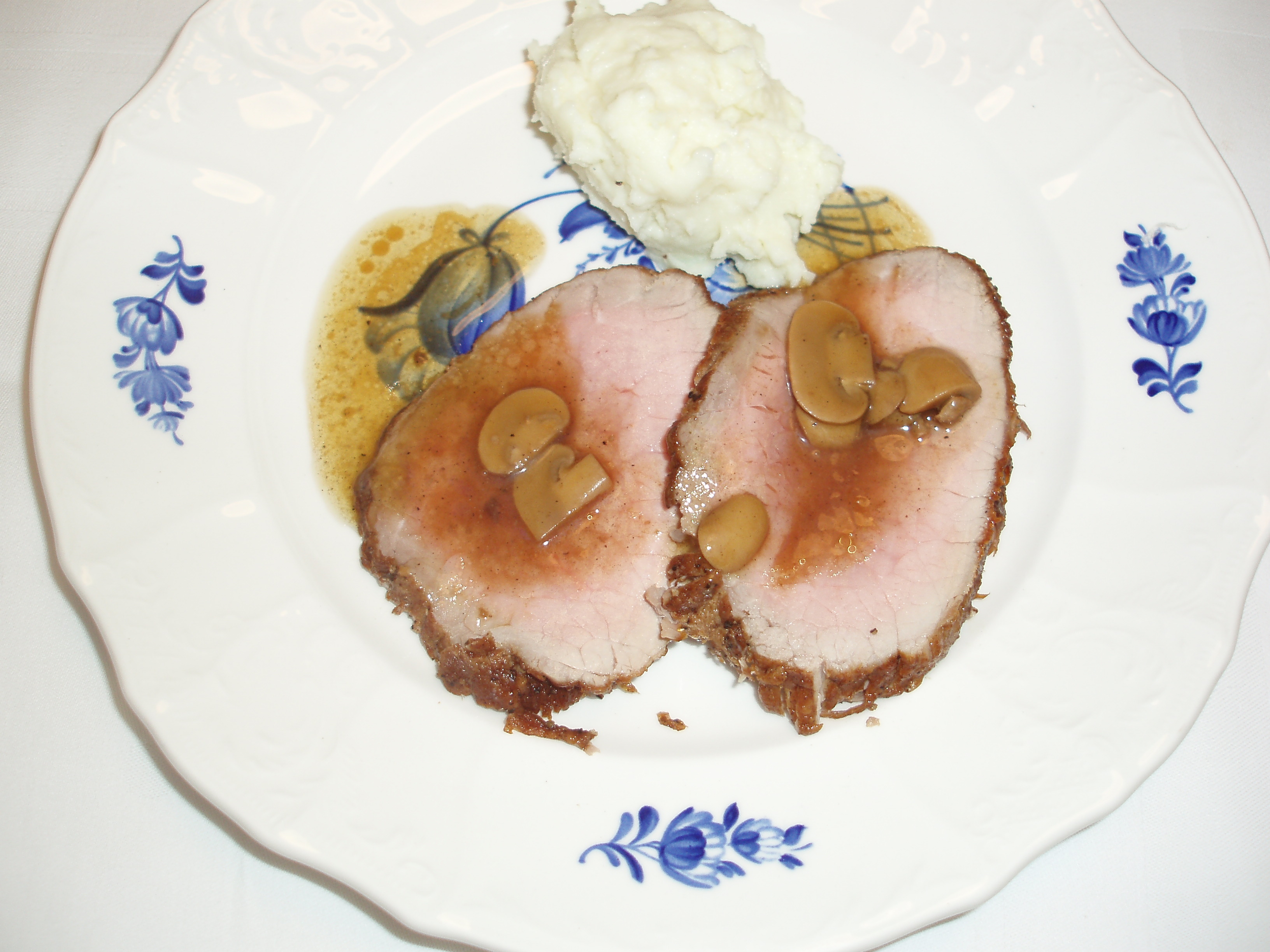 Para terminar, una vez reposada la carne se corta en lonchas finas y se sirve con la salsa a parte. Yo suelo acompañarla con un puré de patas ( si queréis podéis gratinarlo en el horno que queda muy chulo). Un beso.