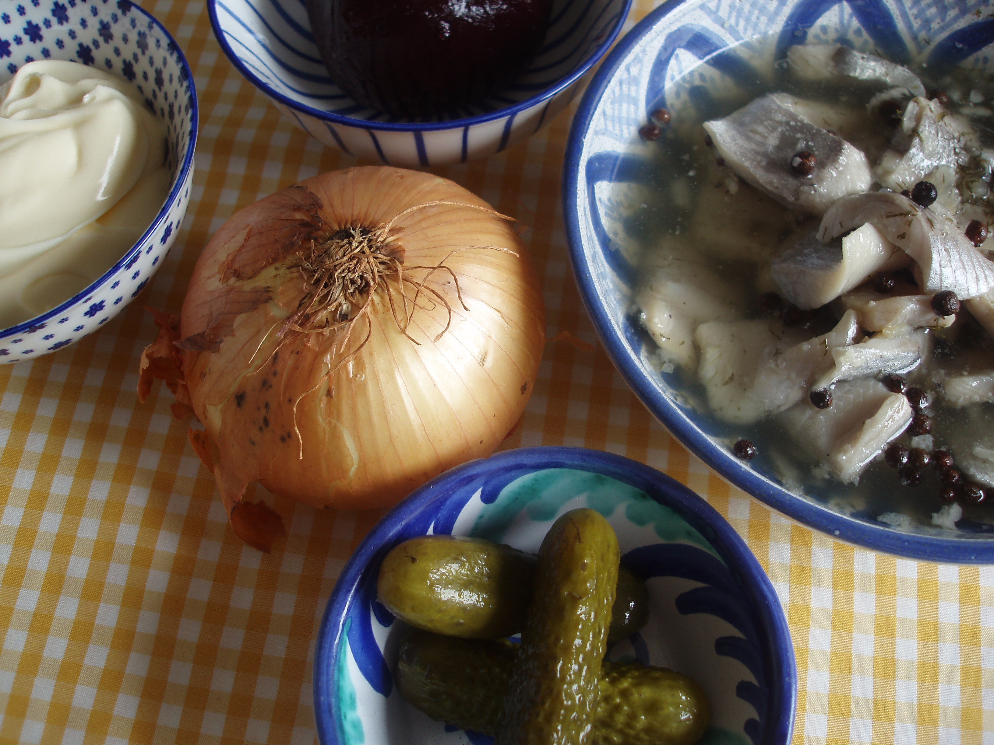 Cortamos los arenques y la remolacha en tiritas no muy grandes, y cortamos la cebolla en juliana ( tiritas) lo más finamente que podamos. Lo ponemos en un bol todo junto y lo mezclamos.En otro bol ponemos dos cucharadas colmadas de mayonesa (si la tenéis casera perfecto), el yogour y los pepinillos picados pequeñitos, agregamos un poco del líquido de los arenques y lo sazonamos con pimienta.