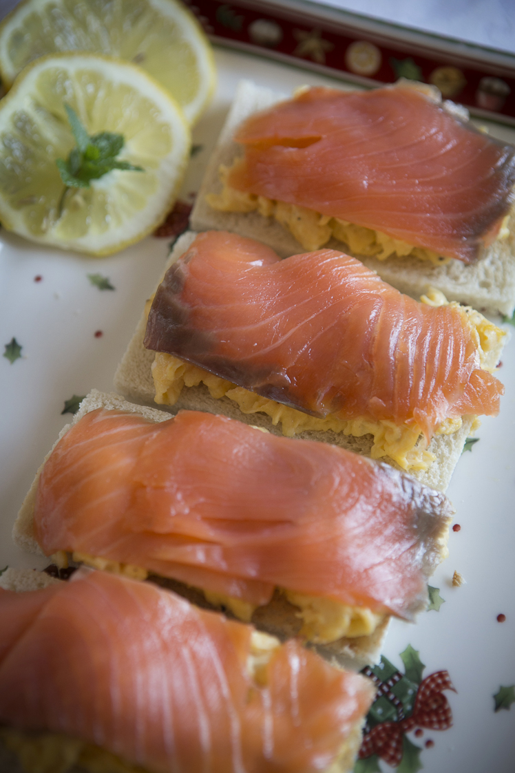 Mini tostas holandesas: Tostamos las rebanadas de pan a las que previamente hemos quitado los bordes, y las cortamos por la mitad.Batimos bien los huevos , los salpimentamos y hacemos en una sartén con aceite un revuelto (cuando estén prácticamente, sacamos del fuego y le añadimos una cucharada de mayonesa y revolvemos). Ponemos encima de cada tostada un poco de huevo revuelto y encima un trozo de salmón ahumado cortado rectangular para que quede curioso.