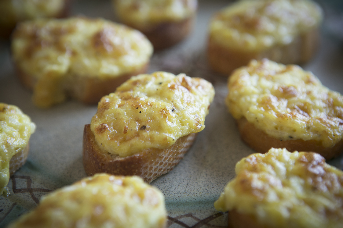 Canapés de cebolla y queso: Cortamos la baguette en rebanadas no muy gordas (de 12 a 15). En un bol mezclamos 3 cucharadas de mayonesa con la cebolleta lo más finamente que puedas picarla, una cucharadita de mostaza , 3 cucharadas colmadas de queso molido y una pizca de pimienta. Ponemos un montoncito de esta farsa encima de los panecillos y gratinamos en el horno previamente precalentado.