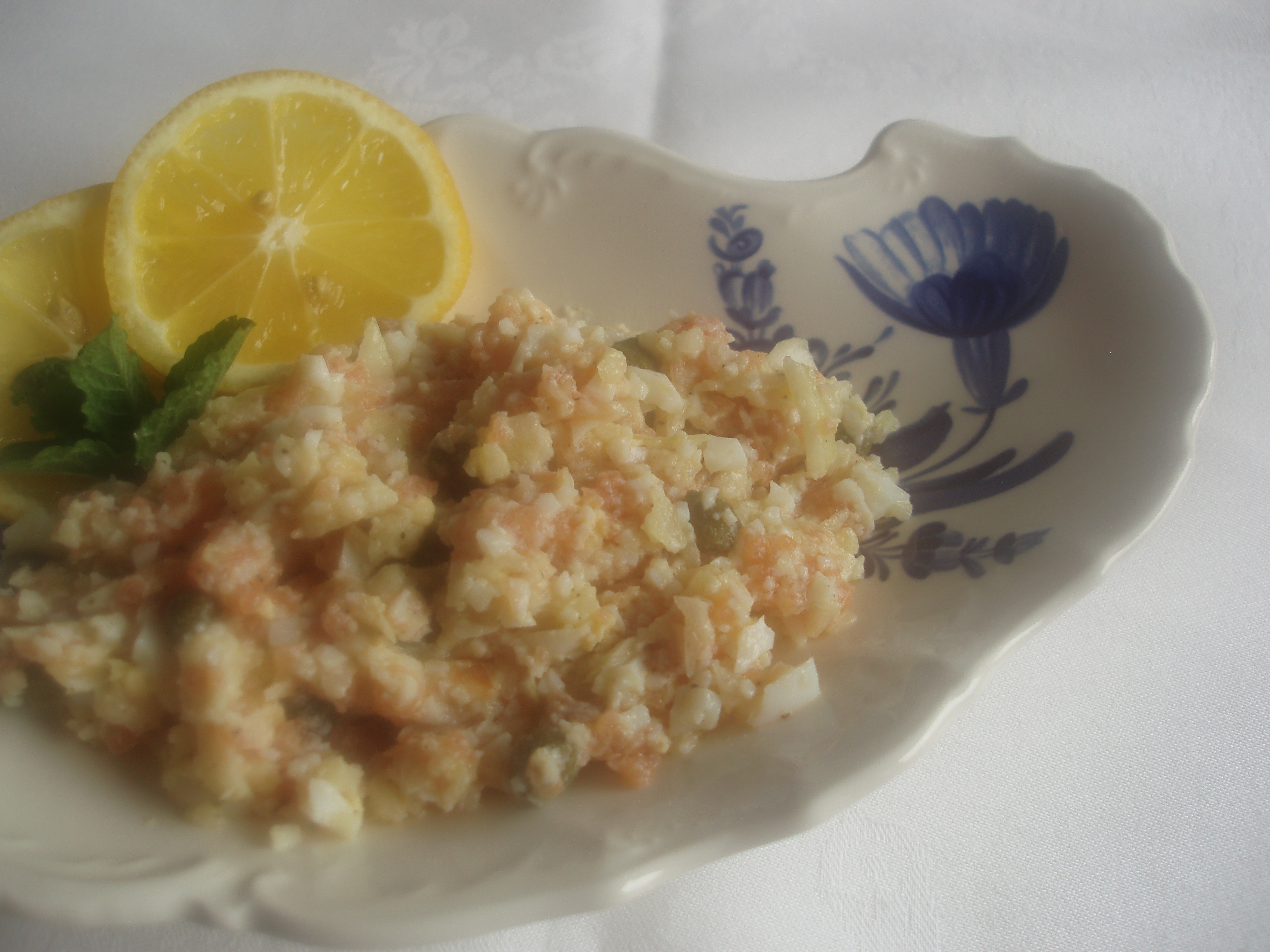 Picamos el salmón ahumado en la picadora y lo ponemos en un bol, después picamos los huevos y los añadimos al bol y por último la cebolleta a mano, lo más finito que podamos. Lo metemos en un bol y lo mezclamos. Añadimos las alcaparras y las mezclamos, por último amalgamamos todo con un chorrito de aceite de oliva virgen extra del bueno y sazonamos con la sal y la pimienta.
