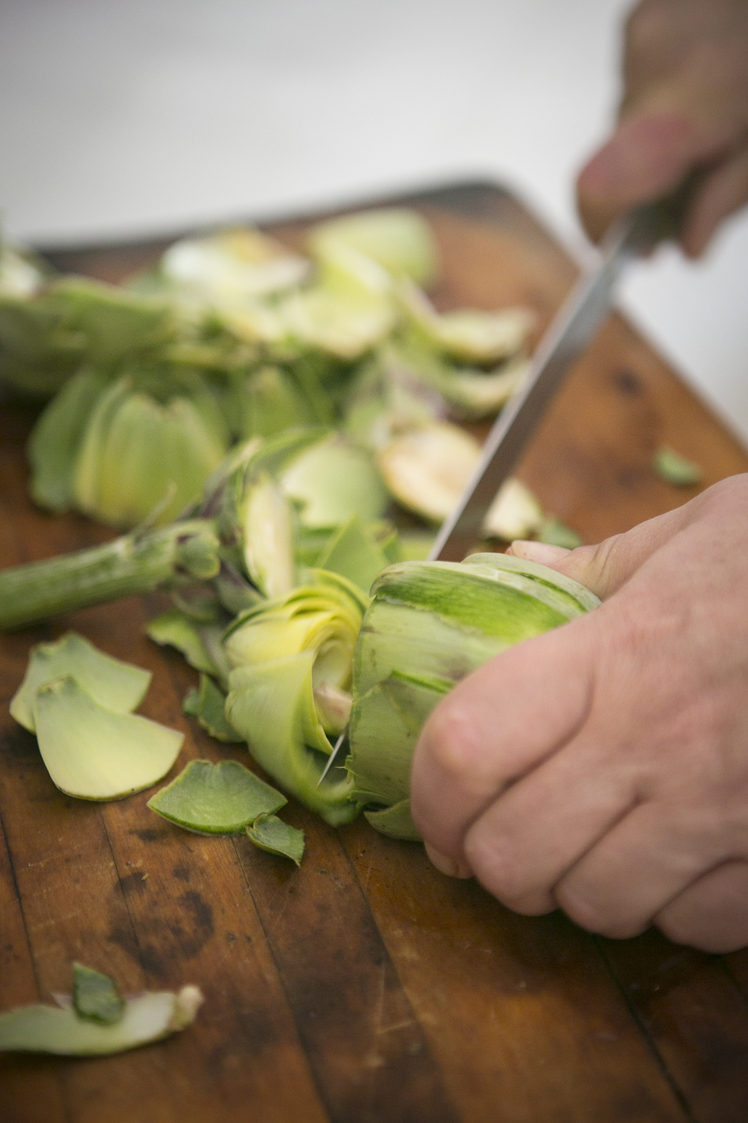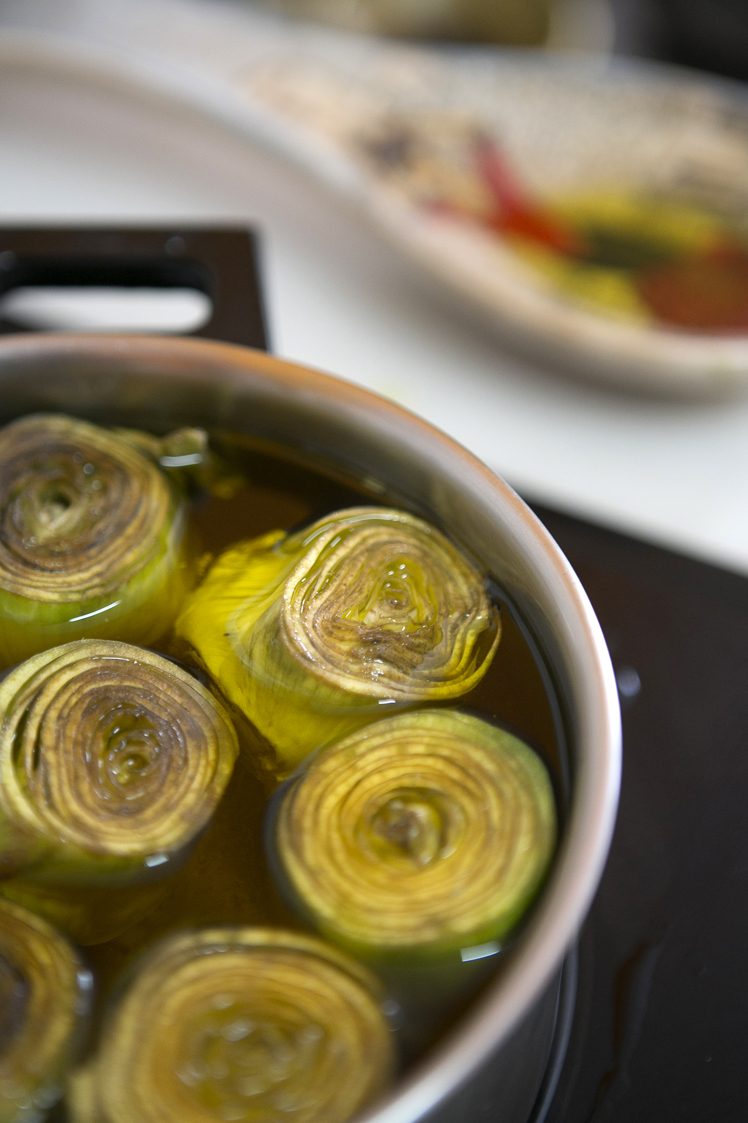 Retomando el post anterior y metiéndonos directamente en harina, María se puso a confitar las alcachofas a las que había quitado las hojas exteriores y dejado el corazón.