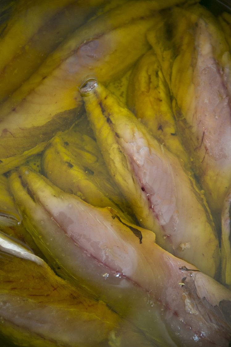 Como las xardas o caballas, ocupan más espacio que las alcachofas cambió el aceite de confitar las alcachofas a una tartera de mayor diámetro, para que no se amontonen a la hora de meter los lomos limpios y salados.