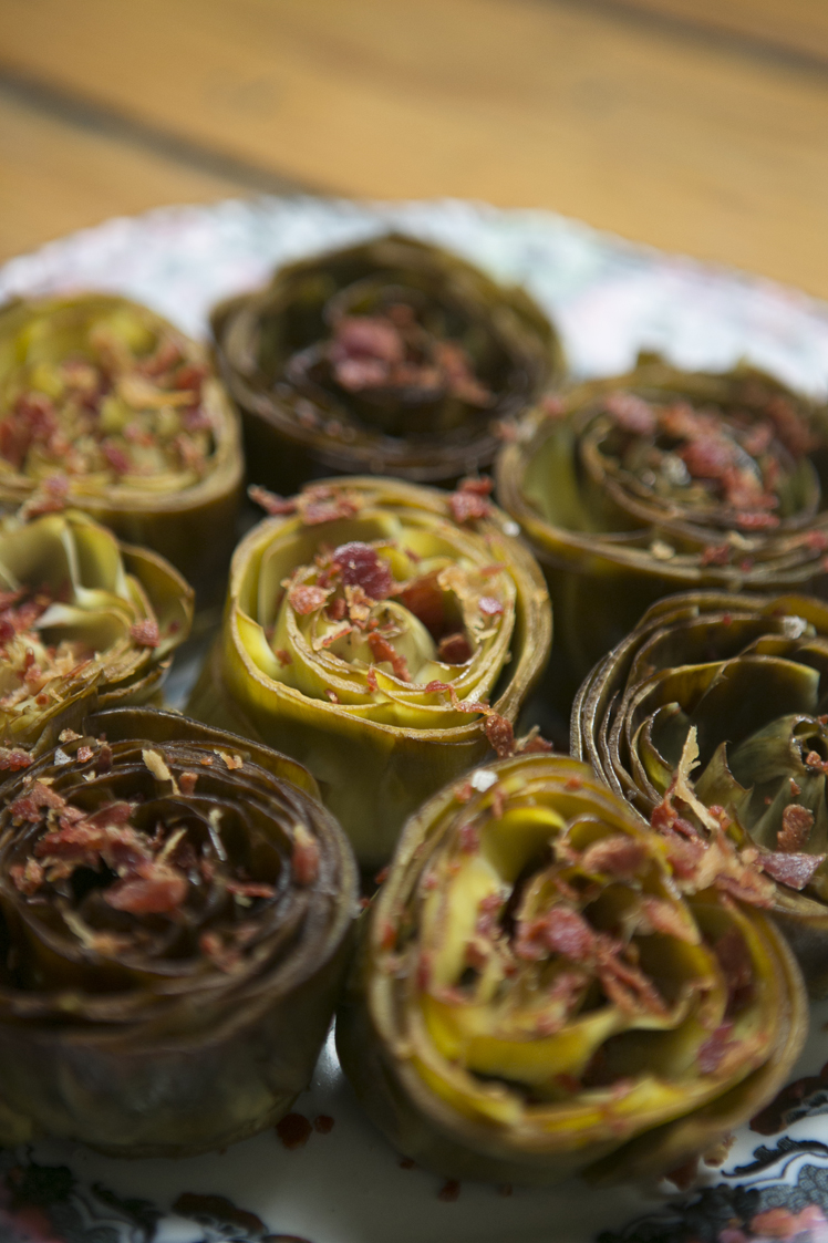 Una vez que las alcachofas tienen la textura deseada, las sacó a un plato con papel de cocina para quitarles el exceso de grasa y ayudada con un par de tenedores fue abriendo las hojas de las alcachofas para darles una bonita forma de flor. Las espolvoreo con jamón que había deshidratado en el microondas metiendo las lonchas entre dos papeles de cocina.