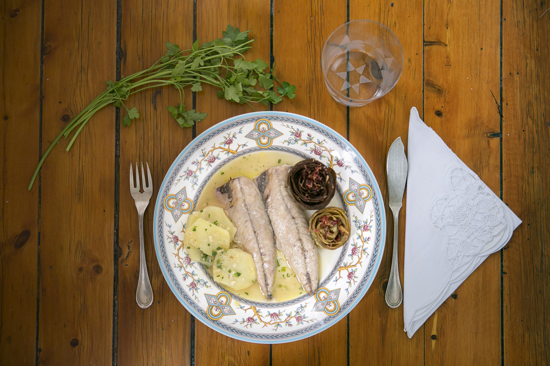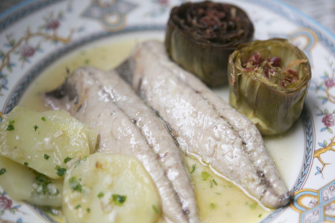 Otra de las cosas que hizo, mientras se confitaban las alcachofas, fueron las patatas a la marinera, ¡aún me parece estar oliendo esa deliciosa salsa!. En una tartera calentó un chorretón de aceite de oliva, y añadió un buen puñado de ajo picado (unos 5-6 dientes) y media cebolla pequeña morada (de mayor dulzor que la blanca) picada menuda. Cuando cambió de color añadió una cucharada de harina y dando un par de vueltas seguidamente agregó el caldo caliente. Añadió las patatas peladas y cortadas en rodajas como de un dedo de grosor, sazonó y dejó que hirvieran suavemente durante unos 20 minutos (hasta que ablanden). Y remató adornando con perejil picadito.