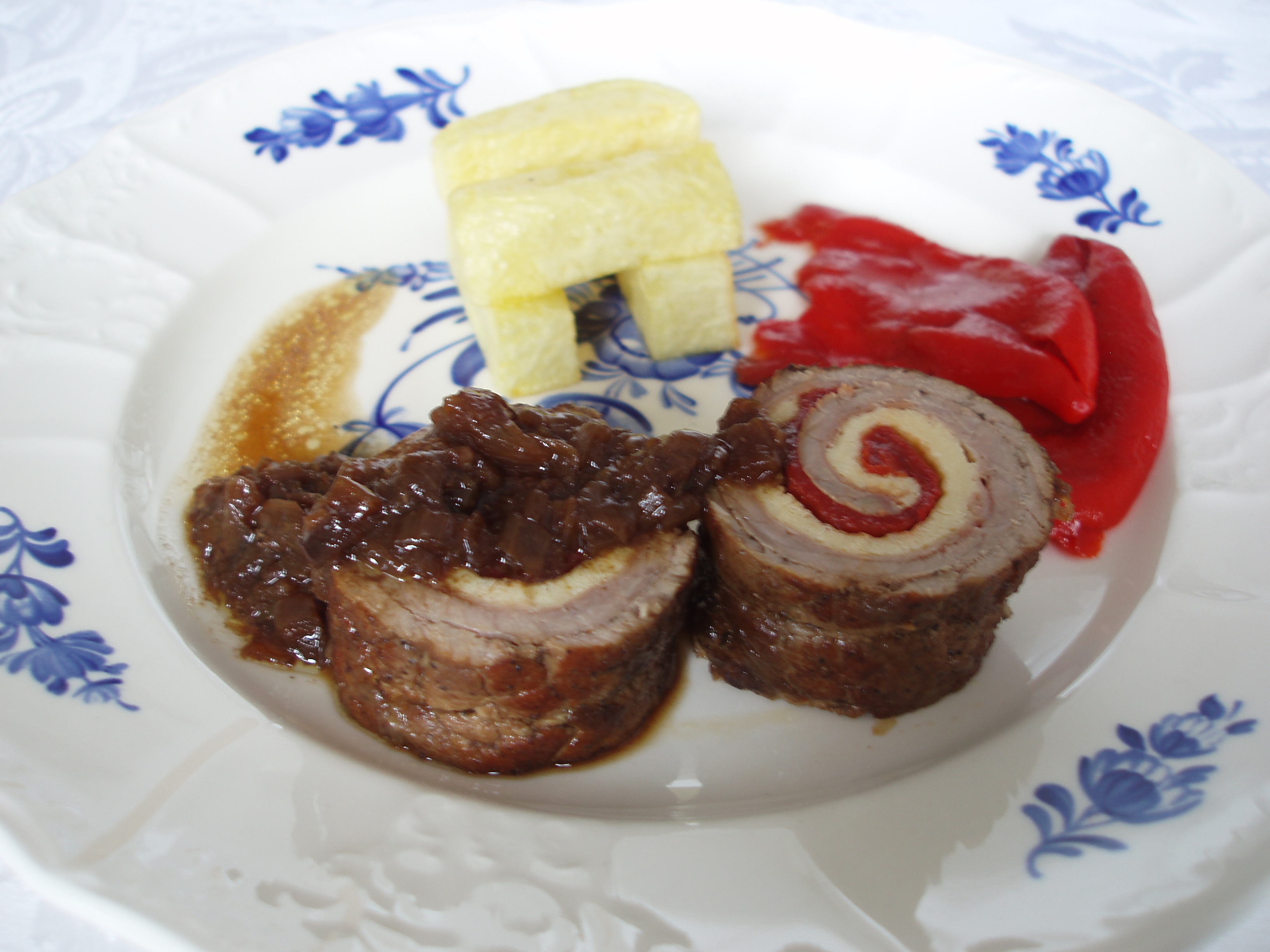 Machacamos un poco los filetes para afinarlos y los salpimentamos por un lado, extendemos con la parte sin salar hacia arriba y los untamos con mostaza (la que tengáis), los cubrimos con 2 lonchas de jamón, dos pimientos del piquillo abiertos y la tortilla hasta la mitad más o menos (si pones el relleno extendido por toda la superficie del filete, al enrollarlo se te saldrá).