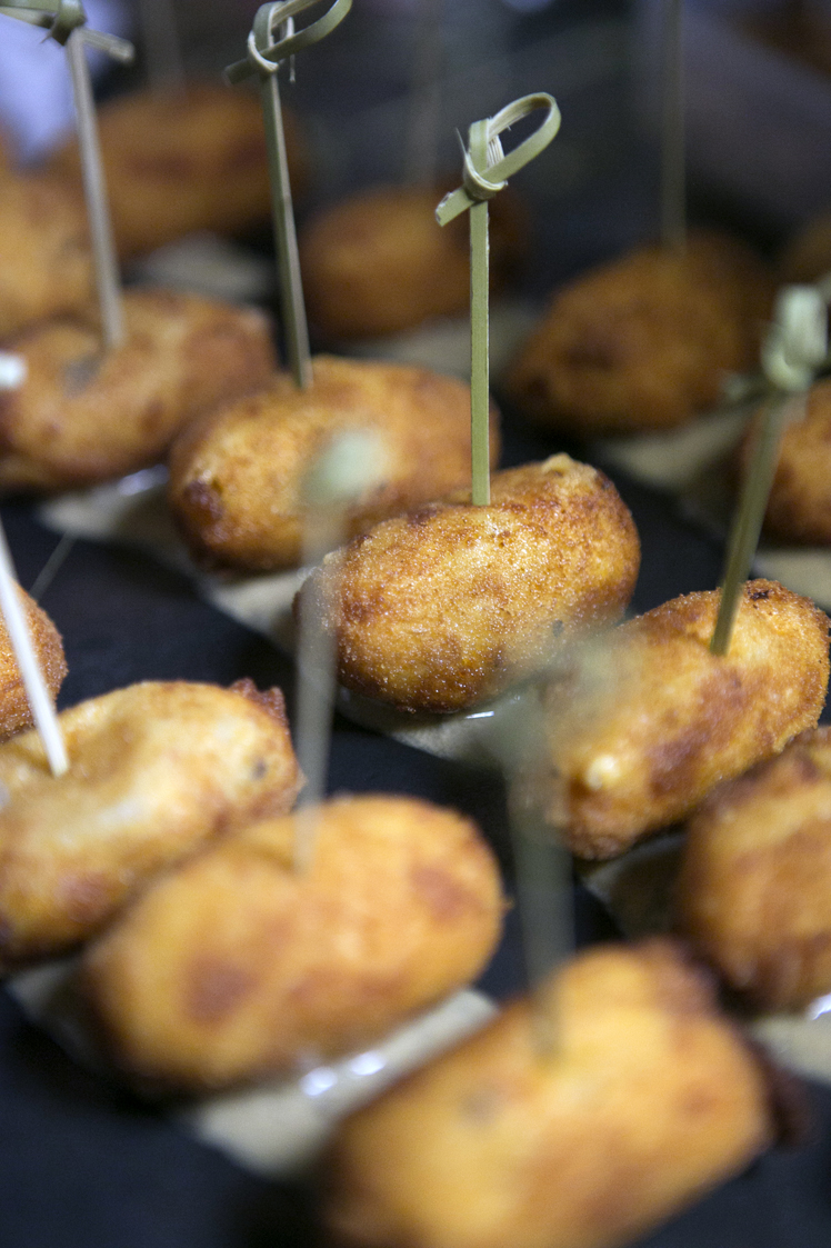 Para empezar puse unas croquetas de picadillo de chorizo sobre una rica crema de queso azul, combinación que queda muy agradable y que conforma un aperitivo muy gustoso. Quedan muy chulas presentadas sobre una pizarra y ensartadas con unos bonitos palillos de bambú.