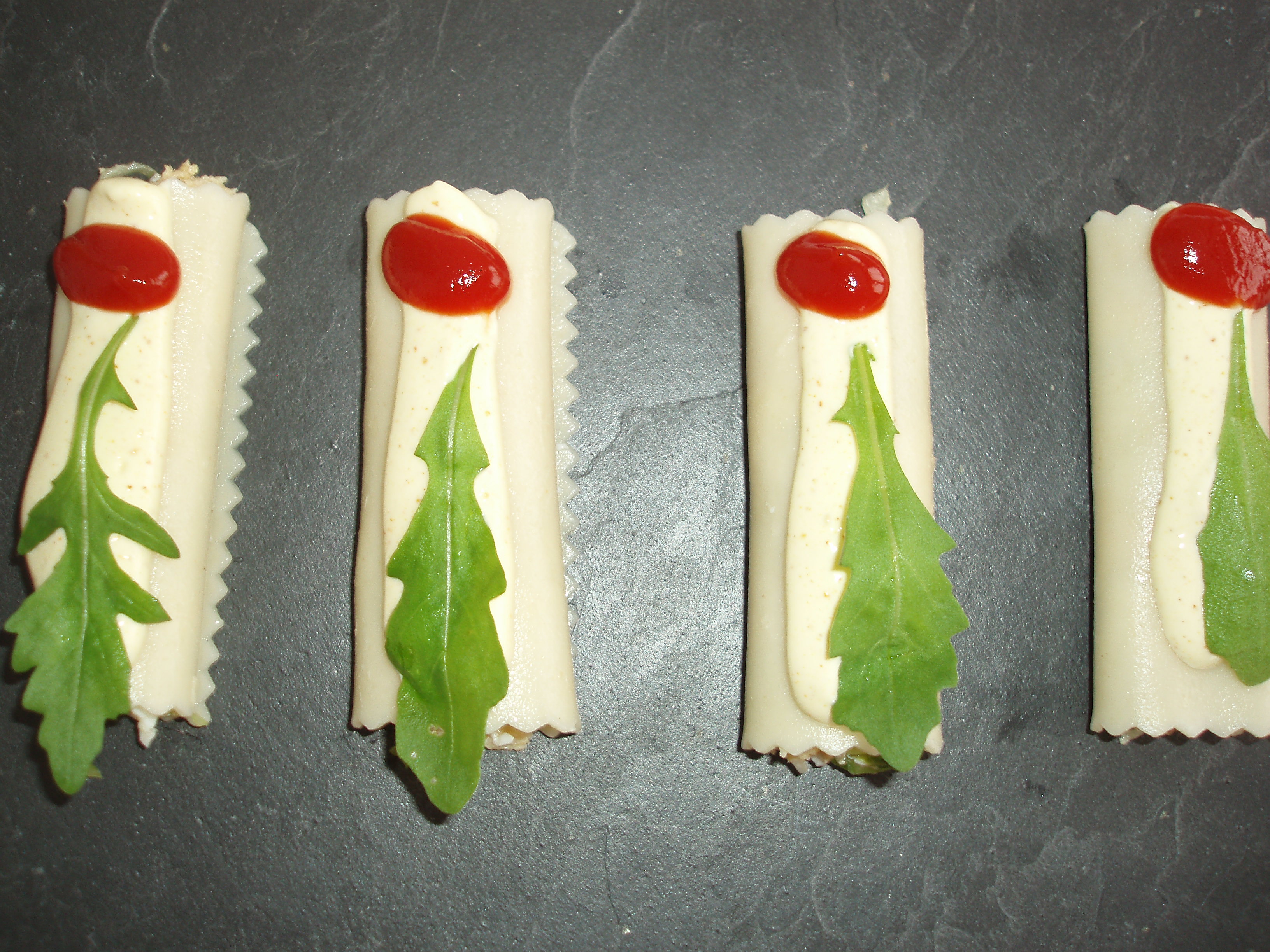 Yo para rematar el plato adorné la superficie de cada canelón con un poco de la salsa, un punto de salsa ketchup y una hojita de rúcula. Un beso.