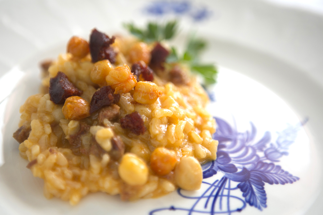 Hay un refrán popular que dice «cuando el diablo está aburrido mata moscas con el rabo», yo ni soy el diablo ni tengo rabo, con lo que cuando estoy aburrida me da por maquinar recetas que puedan tener algún interés. Fruto de esos paseos con el perro es este risotto que podríamos denominar como fusión italo-española.