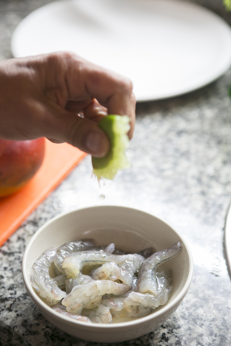 Lo primero que hay que hacer es macerar las gambas en el zumo de una lima, cocinar con el acido de los cítricos es algo que nosotros no tenemos mucha costumbre, pero que cada vez se ve más.