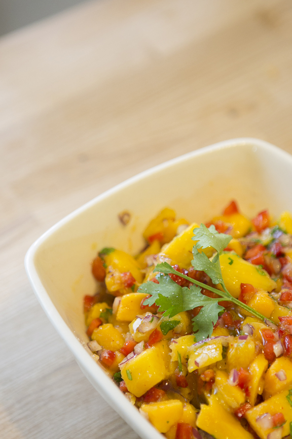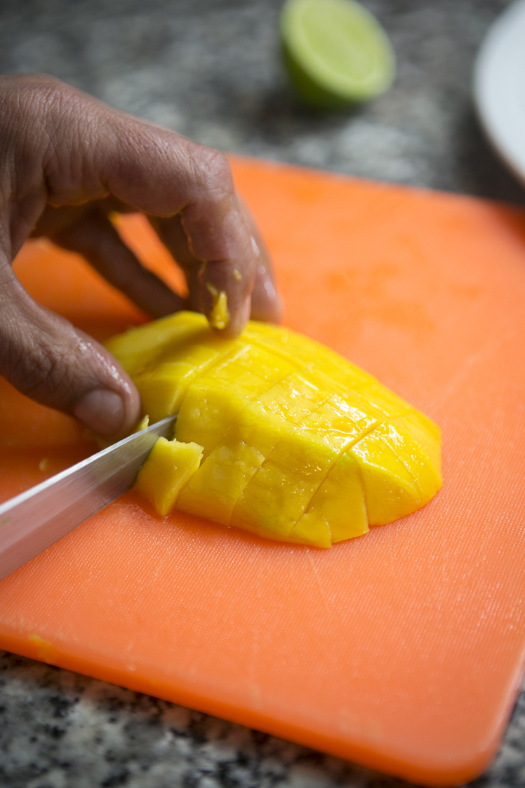 Mientras las gambas se van haciendo, corta el mango en daditos no muy menudos.