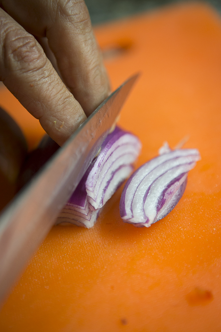 Tambien pica media cebolla morada, pero esta vez si lo hace mucho más menuda, me cuenta la importancia de los cortes de los ingredientes que cada uno tiene su manera para lograr la armonía del plato.