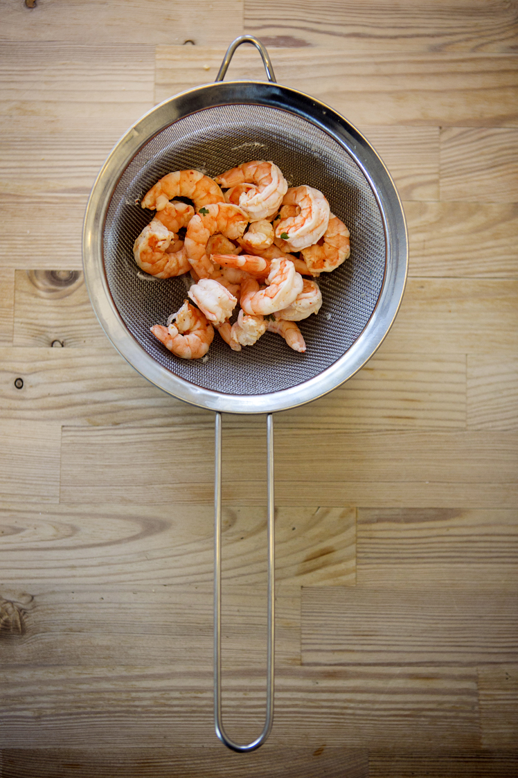 Puestos estos ingredientes en un bol, se le añaden las gambas, que previamente ha puesto un par de minutos al vapor utiliuzando un método que os voy a contar pues me pareció super práctico, poner un cazo al fuego con un poco de agua y una vez que esta comienza a hervir, colocáis las gambas en un colador sobre el cazo para que se hagan al vapor.