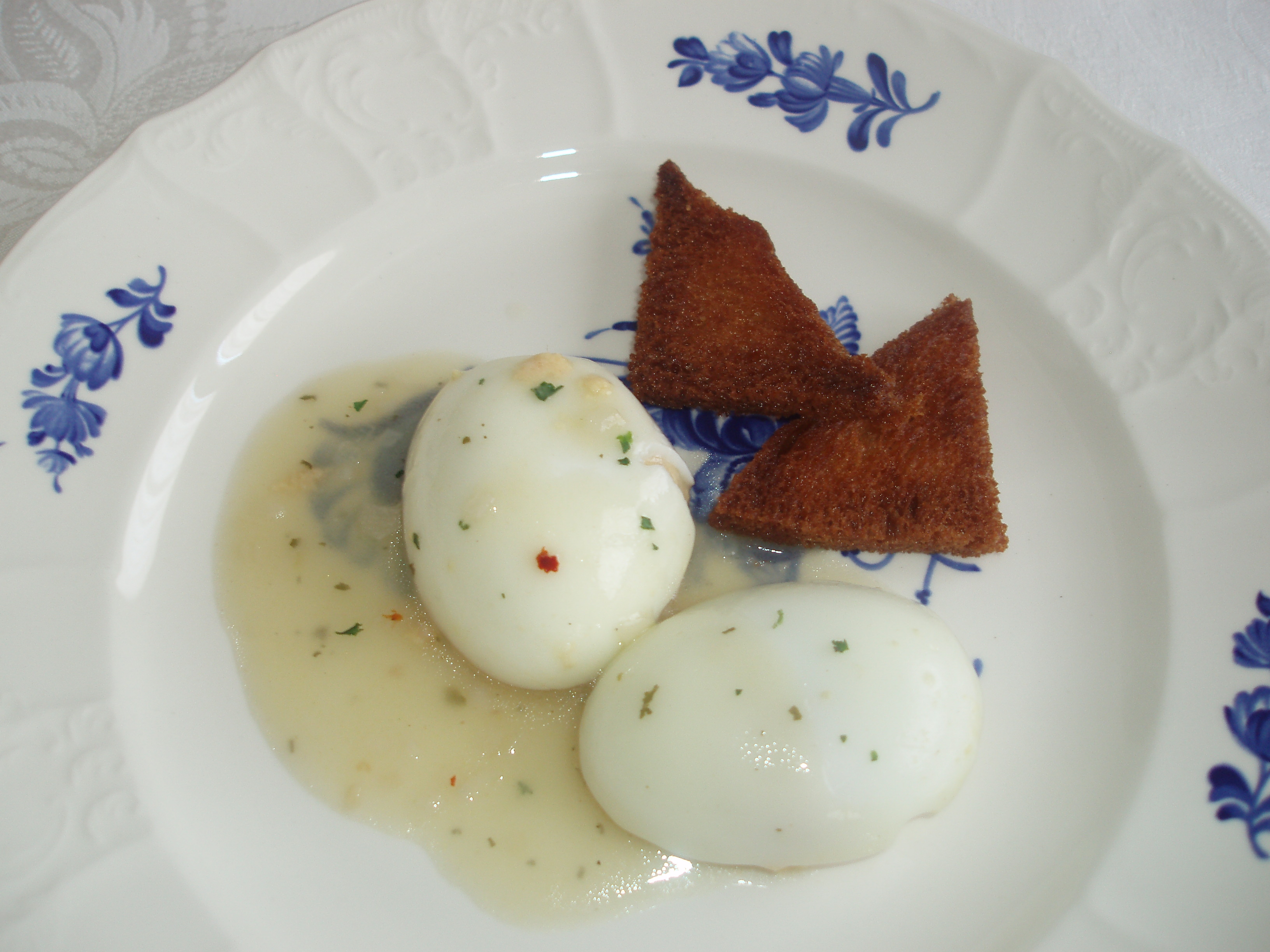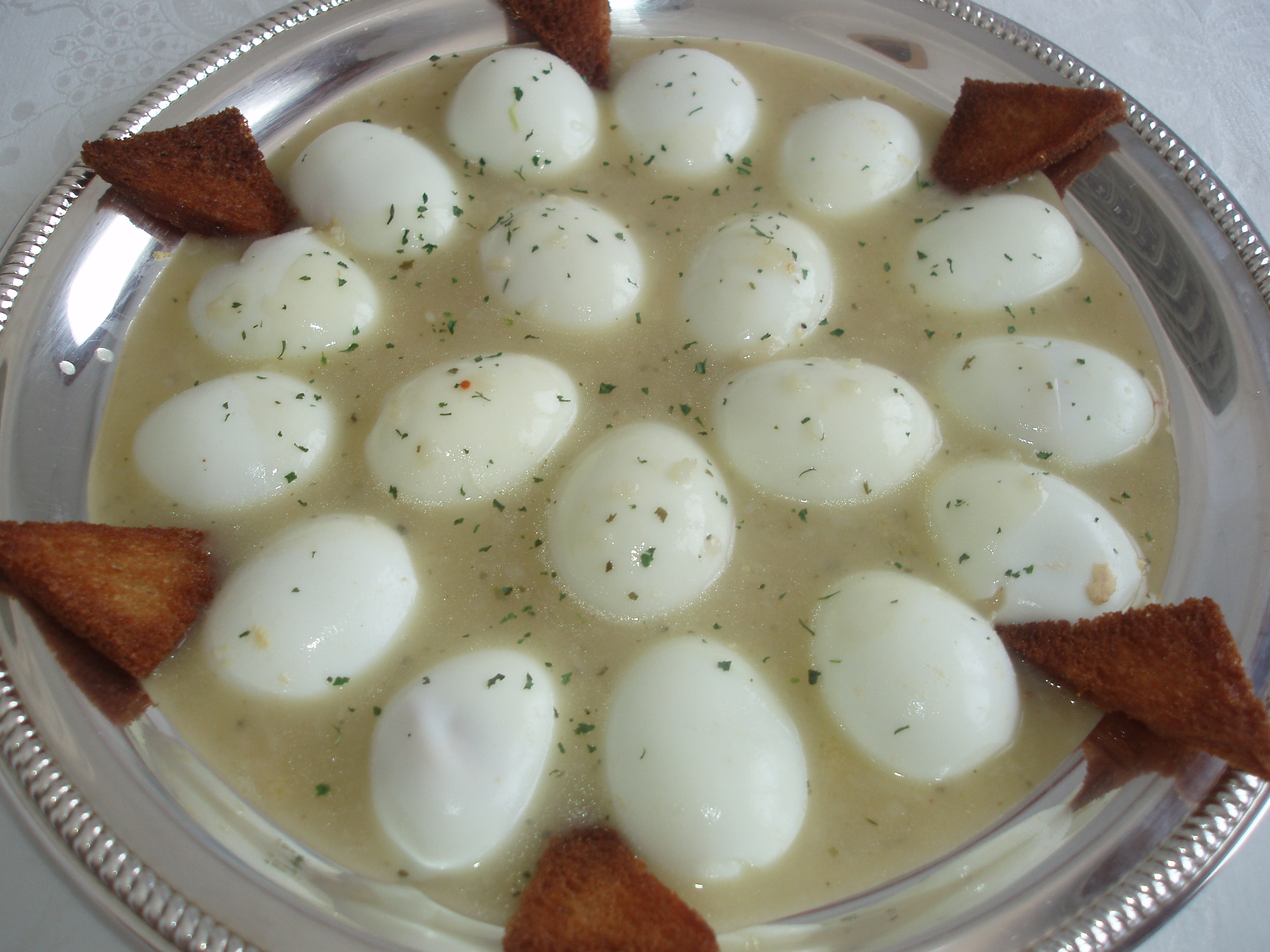 A la hora de ir a comer, se calienta muy bien la salsa y se vierte por encima de los huevos, la que no te quepa la pones en una salsera, y adornáis la fuente con los triángulos de pan frito. Un beso.