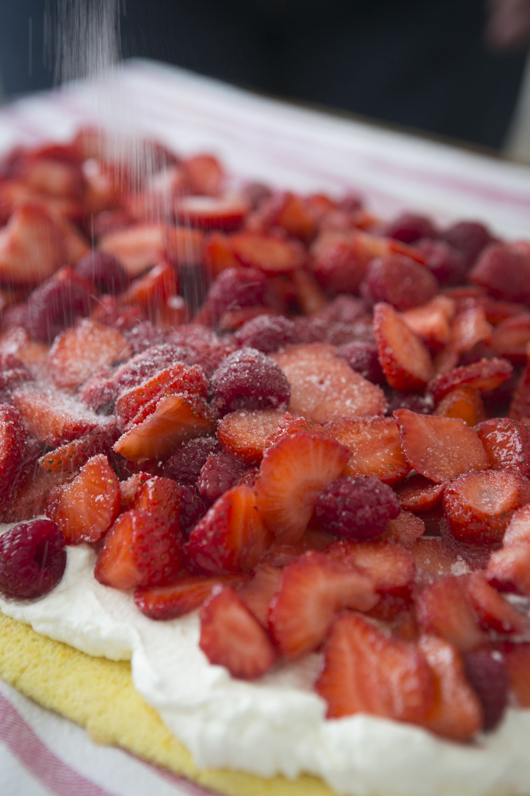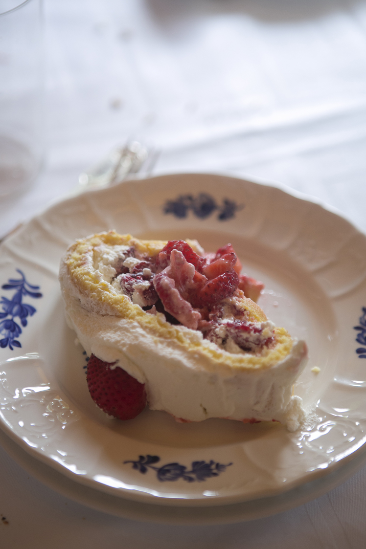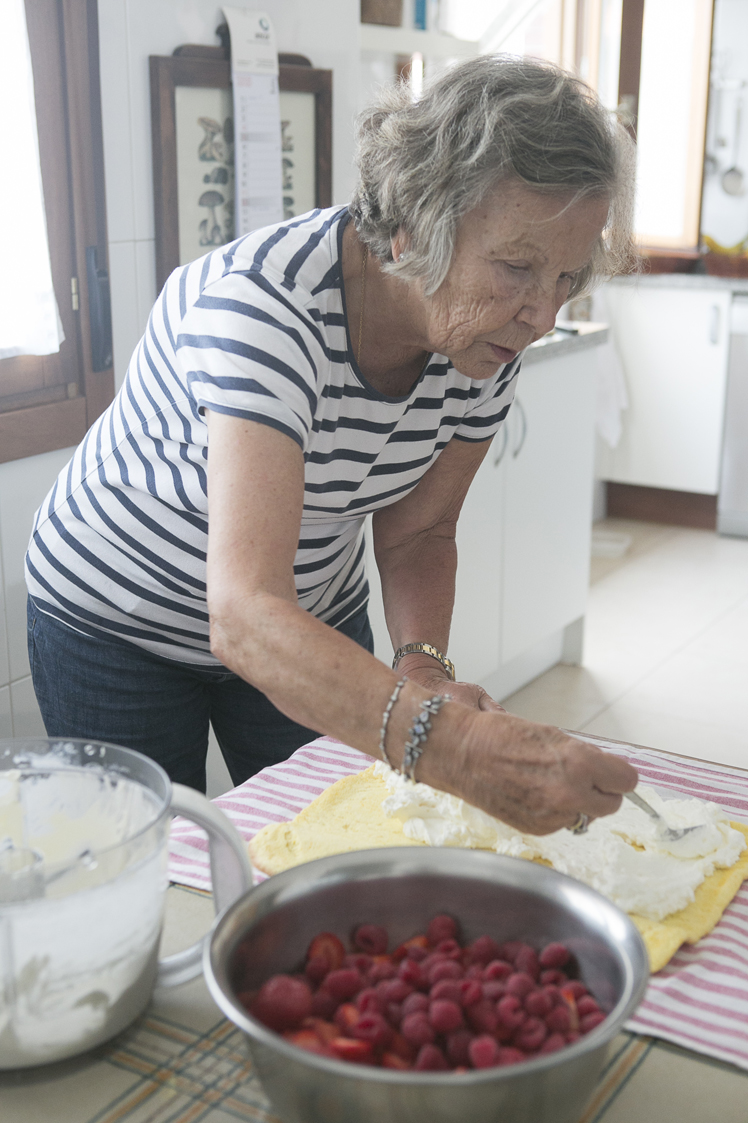 De todas las tartas que hace, que son muchas y muy buenas, ya os conté alguna como la tarta de manzana y almendras, una que a mi me gusta en especial es un brazo gitano de fresas, frambuesas y nata.