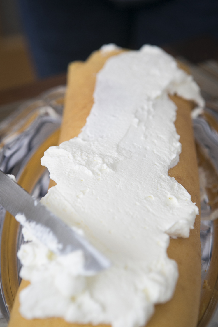 Para montar el brazo desenroscáis el bizcocho y lo dejáis sobre un paño, lo cubrís con 2/3 de la nata.