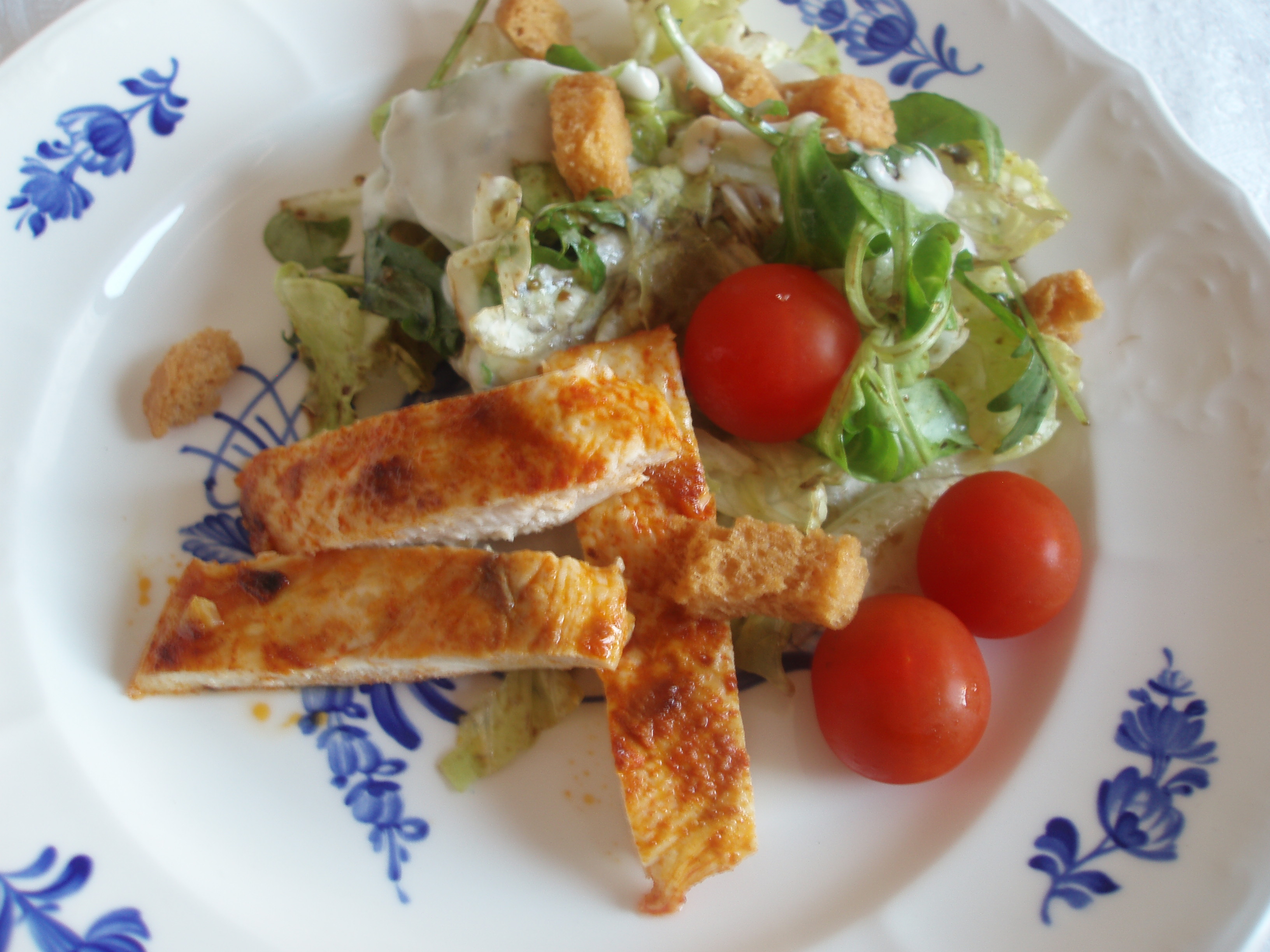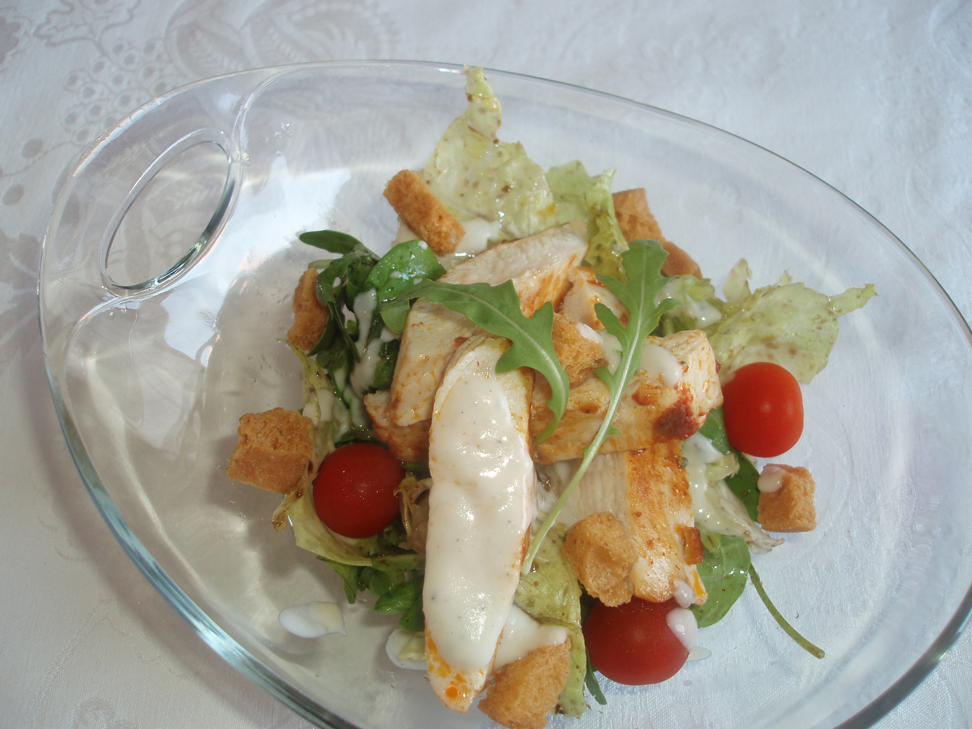 Poner las lechugas limpias y troceadas en un bol y aliñar con la vinagreta, colocar en la fuente que vayamos a usar o directamente en los platos. Rociar con la salsa de queso y coronar con las tiras de pollo, dar una nota de color con los tomates cherry.