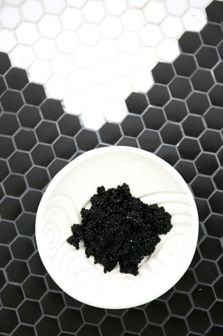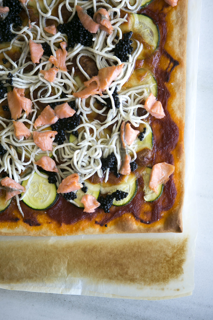 Una vez que el queso está fundido, nuestra masa dorada y el calabcín ablandado, saca la pizza del horno y coloca sabiamente distribuidos los demás ingredientes: las gulas, el salmón ahumado cortado en trocitos y las huevas. Luego, la vueve a introducir otra vez en el horno unos 5 minutillos para que calienten estos ingredientes.