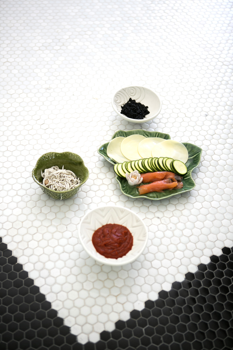 Como veis, los ingredientes son sencillos y se compran elaborados. La masa era comprada hecha, de la marca Buitoni, de la gran familia de alimentos Nestle. Pero si hay algún atrevido que la haga casera, estupendo. También vais a necesitar algo de salsa de tomate, salmón ahumado, gulas, calabacín, queso en lonchas y huevas (negras o rojas).