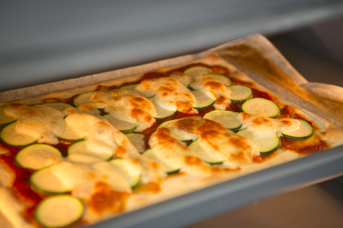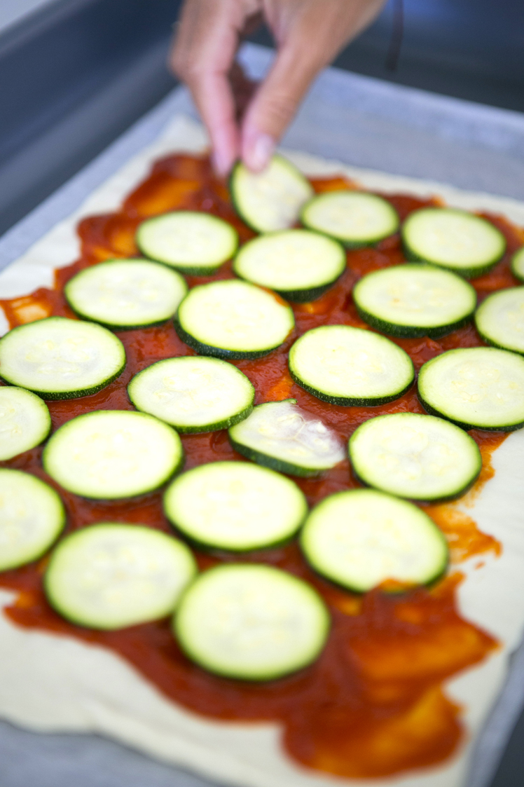 Lo primero que hace es colocar en la bandeja del horno la masa, con el papel que trae bocabajo. Extiende sobre ella la salsa de tomate y, encima, coloca el calabacín que ha cortado en rodajas finas previamente.