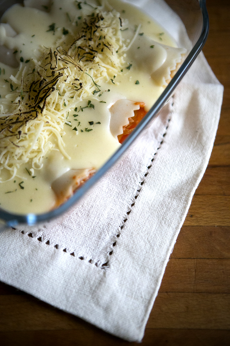 Coger una fuente de horno, cubrir el fondo con una capa de salsa de tomate y colocar sobre esta los canelones. Ahora es el momento de cubrirlos con una bechamel que haremos derritiendo en una pota la margarina, añadimos la harina revolviendo para evitar los grumos y poco a poco incorporamos la leche sin dejar de revolver. Dejar cocer unos 10 minutos y sazonar con sal y, si tienes, un poco de nuez moscada, que le va genial.