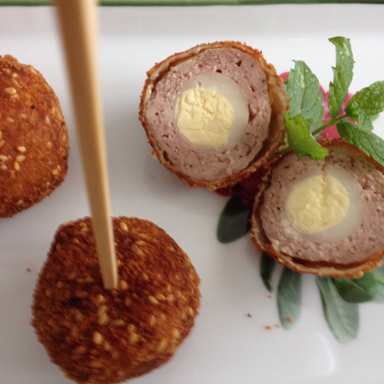 Cogemos un puñadín de carne picada, como para hacer una albóndiga. Hacemos una bola con las manos (ayuda tenerlas húmedas) y, una vez hecha, la aplastamos bien contra la palma de la mano. Obtendremos una especie de disco, en cuyo centro ponemos el huevo cocido de codorniz. Recubrimos éste con el disco de carne picada para lograr una bola con un huevo en su interior.