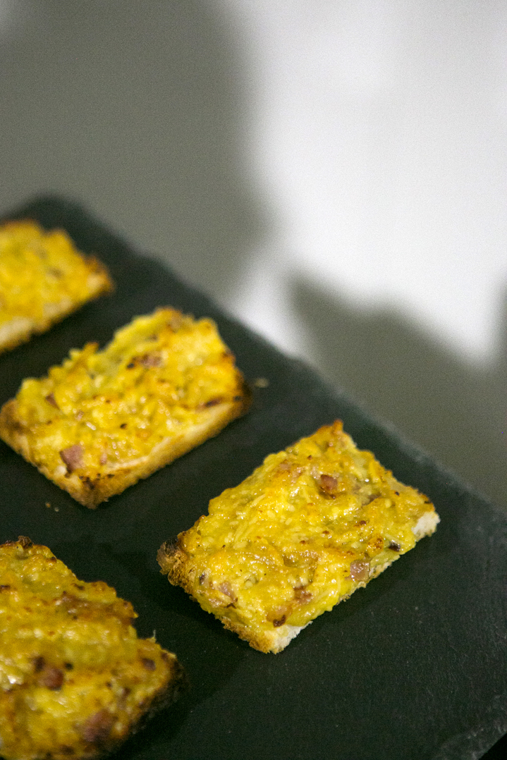 El otro entrante consistió en una riquísima y sabrosa tosta de cebolla caramelizada gratinada. Para hacerla no hace falta más que cebolla caramelizada, tiritas de bacon frito, queso rallado, mostaza (puedes usar la que prefieras) y mayonesa. Mezcla estos ingredientes, pon un montoncito encima de unas tostas de pan de molde y gratínalas en el horno hasta que cojan un precioso tono dorado.
