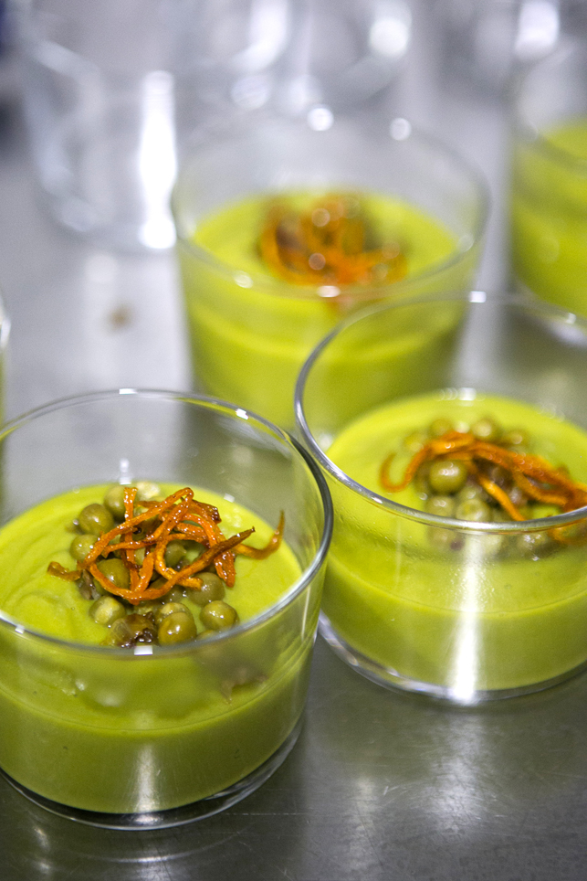 Después de estos dos aperitivos serví unos vasitos de crema de guisantes adornados con un salteado de guisantes y jamón y unas tiritas de zanahoria frita que quedaron muy bonitos, es un plato que puede hacer cualquiera y el resultado es muy vistoso. Para hacerlo no necesitarás más que unos guisantes congelados, de buena calidad, un buen caldo de gallina (ahí está la clave), un poco de cebolla y unos quesitos.