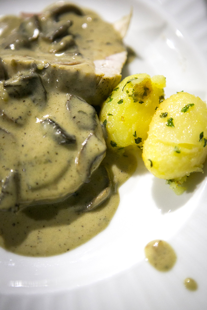 El plato principal está vez fue ave, pollo relleno de carne picada, acompañado por una salsa de champiñones y unas patatinas rehogadas, que ya os contaré la receta en el blog un día de estos, pero sí que os puedo decir que es otro plato fácil y sorprendentemente bueno. La salsa puede variar según os apetezca, pero esta opción de champiñones sé que gustó mucho.