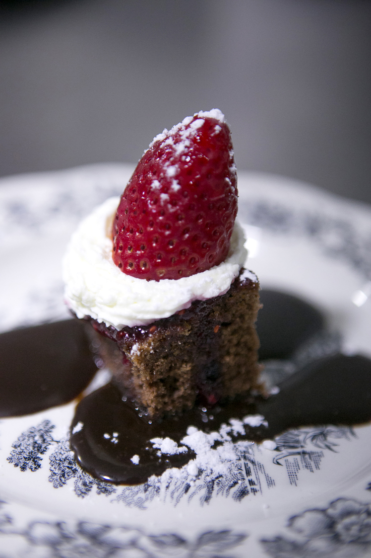 Para terminar esta cena se me ocurrió que nada mejor que un poco de chocolate (siento una desmesurada debilidad por este rico alimento) en forma de bizcochito. Para acompañarlo una crema de nata y queso y coronado, este postre, con una fresa que ahora podemos encontrar prácticamente todo el año. Otra receta que pronto os voy a contar en forma de tarta.