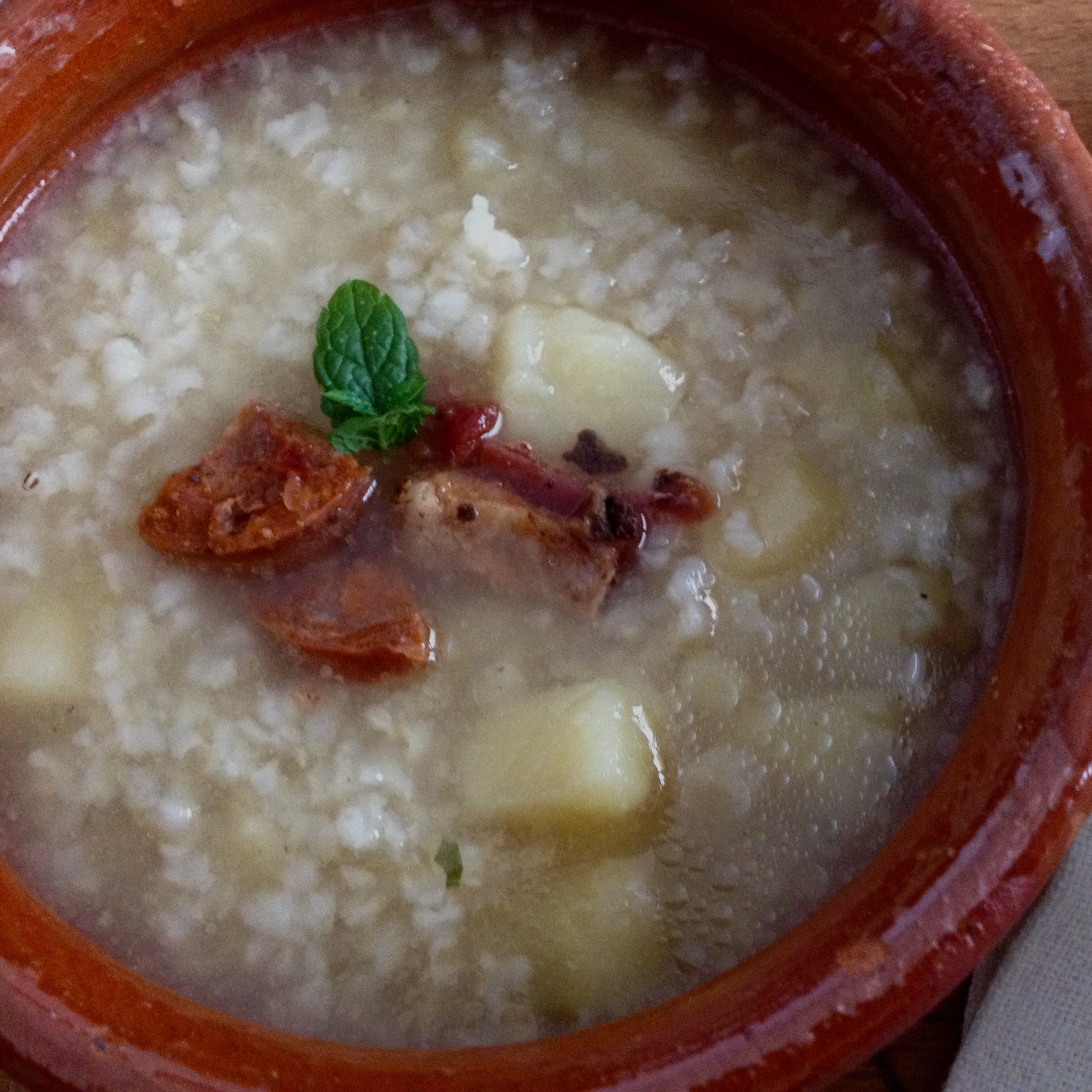 Una vez hecho el caldo lo colamos para quedarnos sólo con el líquido, agregamos las patatas peladas y cortadas en cuadraditos y dejamos que se ablanden durante unos 10 minutos ( el tiempo varía según el tamaño de las patatas). Por último agregamos el arroz cocido y dejamos otros 5 minutillos todo junto.