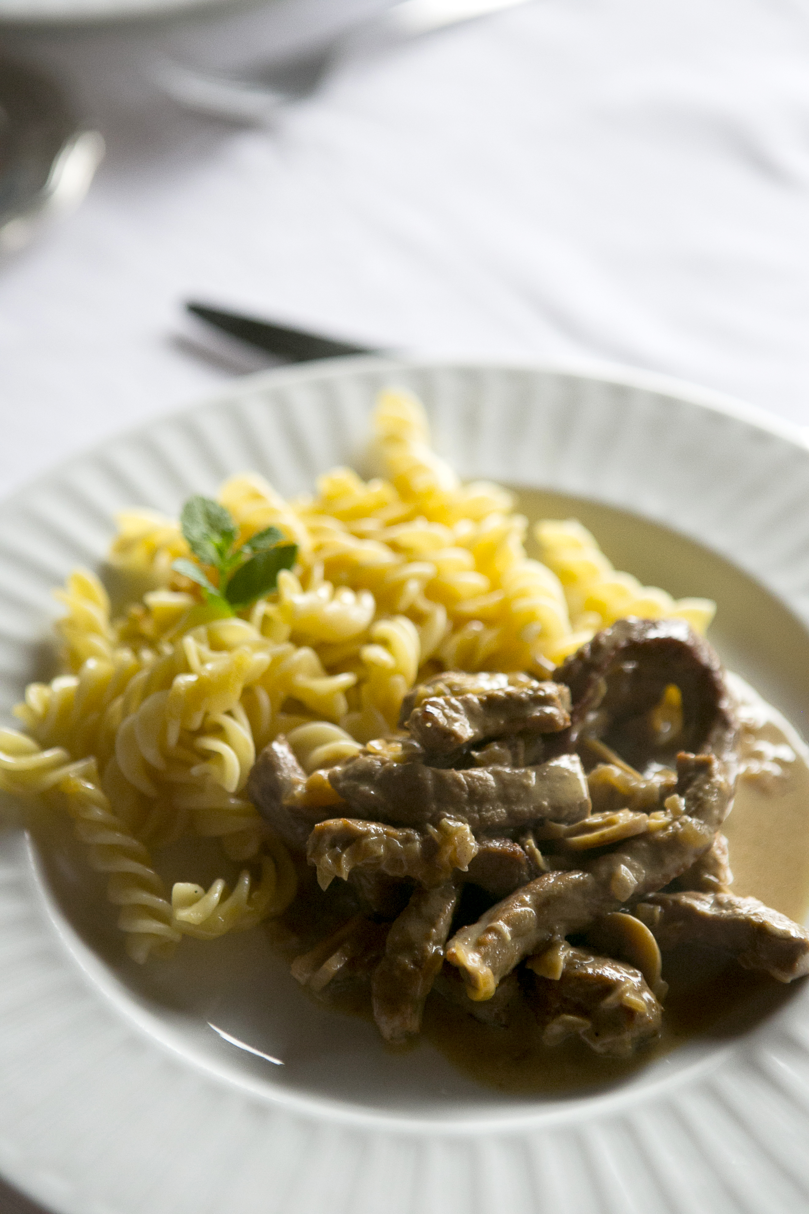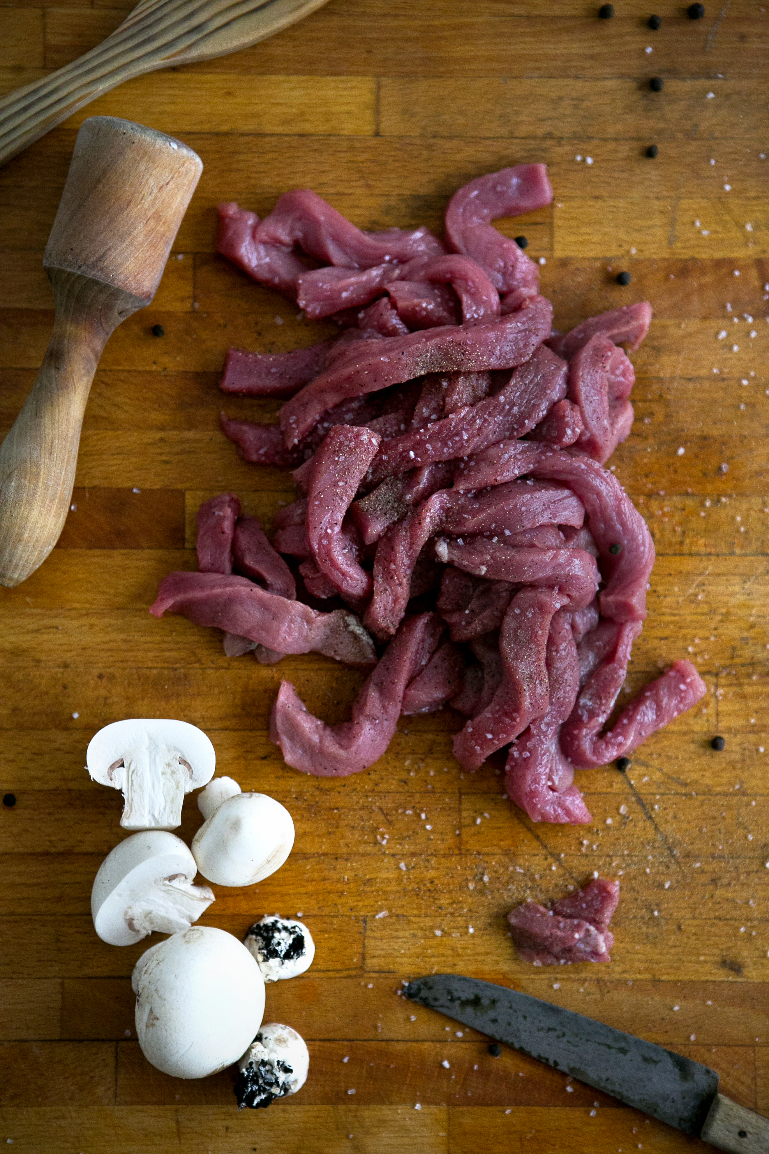 Para empezar nos va a hacer un geschnetzeltes, o sea, unas tiritas de ternera en salsa con champiñones que vamos a acompañar con pasta. Lo suyo es hacer pasta casera, pero hoy nos vamos a conformar con unas estupendas espirales que compras hechas y no te complican.