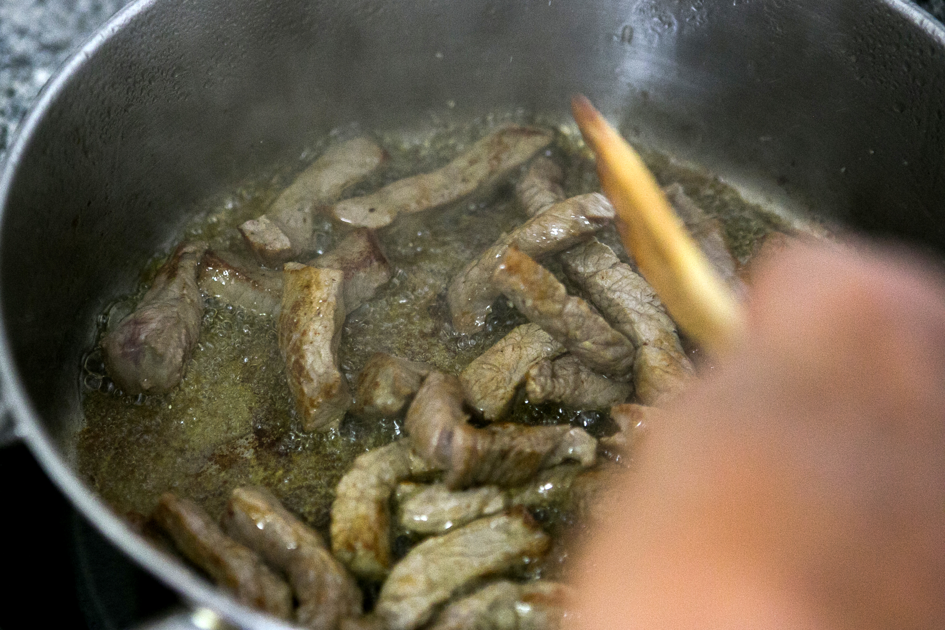 Añade 1/3 de vaso de agua de vino blanco, deja que evapore el alcohol , y una taza de caldo (puedes usar una pastillina o simplemente agregar agua)caliente, dale a todo una vuelta y comprueba el punto de sal. Una vez que la salsa esté hecha añade la carne que tenías reservada.