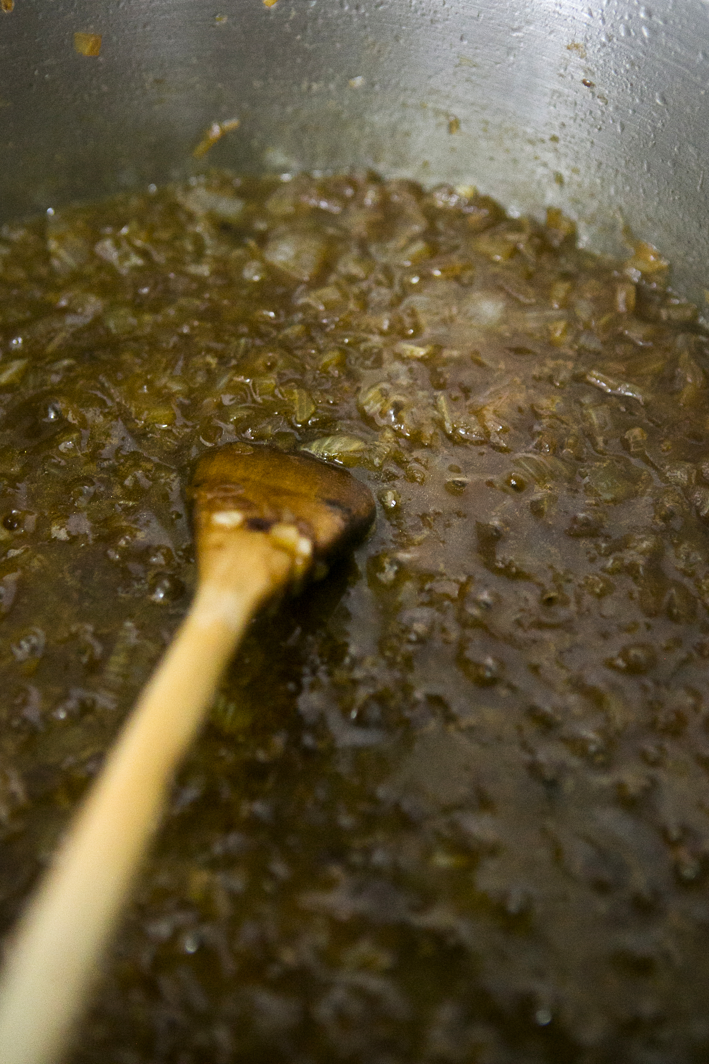 En ese mismo aceite pochas las cebollas picadas finitas hasta que ablanden y adquieran un bonito tono marrón.