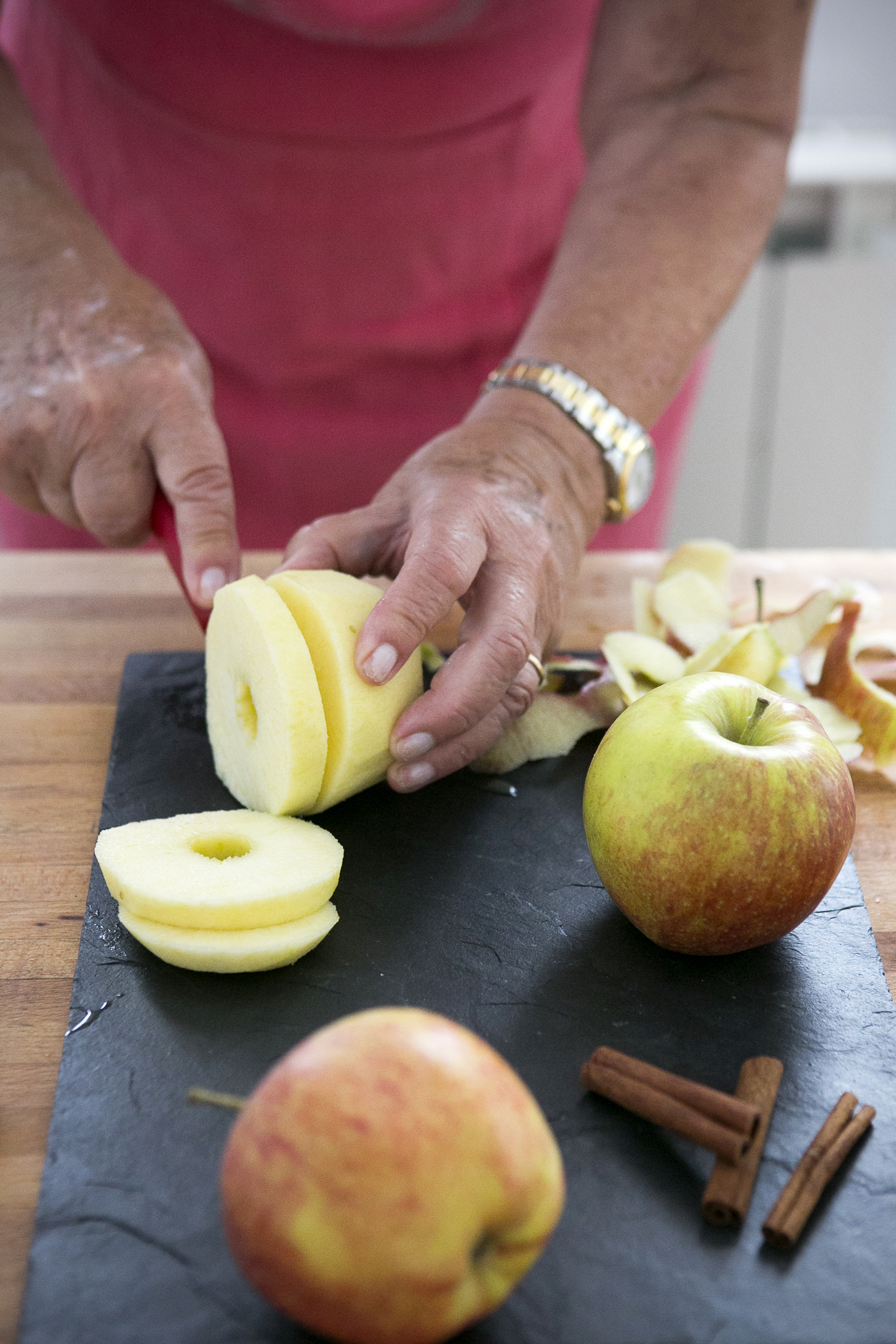 Mientras reposa la masa, pela y corta en rodajas como de un dedo de grosor las manzanas.