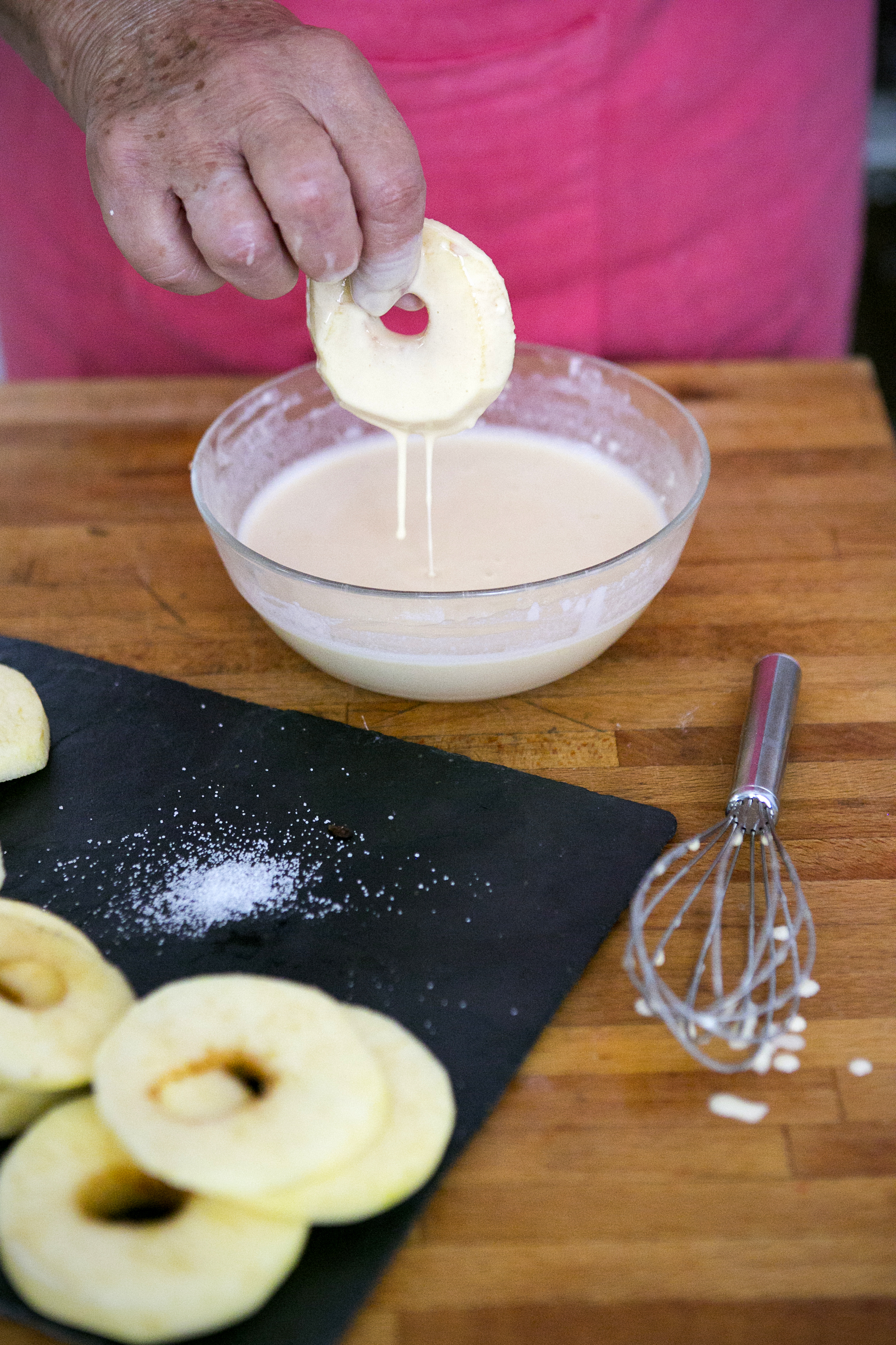 Para ello tienes que poner en un bol la harina con la pizca de sal, añade los huevos batidos y con unas varillas mézclalo con garbo, añade poco a poco la leche y sin dejar de revolver consigue una masa que no sea ni muy líquida, ni muy gorda (1/3 de vaso de leche más o menos), tiene que quedar pegada a la manzana.