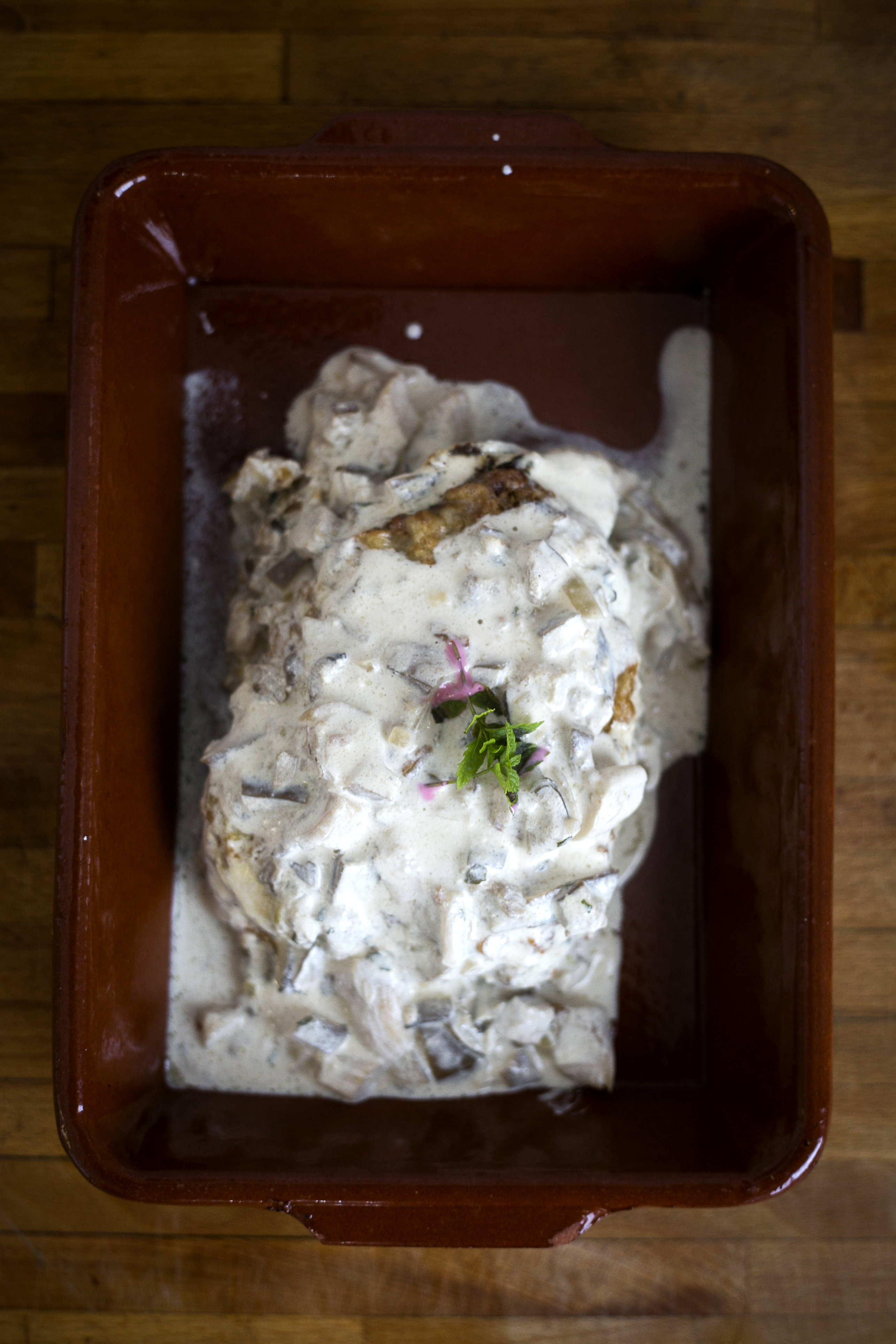 Ingredientes: 2 filetes de ternera «curiosinos», cecina, queso de barra, harina y huevo. Para la salsa necesitarás 1 cebolla pequeña, 1 diente de ajo, aceite de oliva, setas de cardo, medio litro de nata líquida y sal.